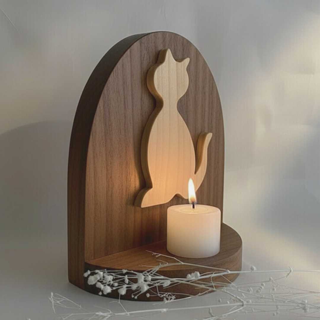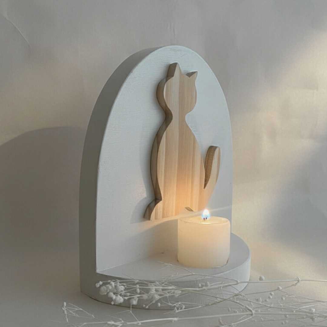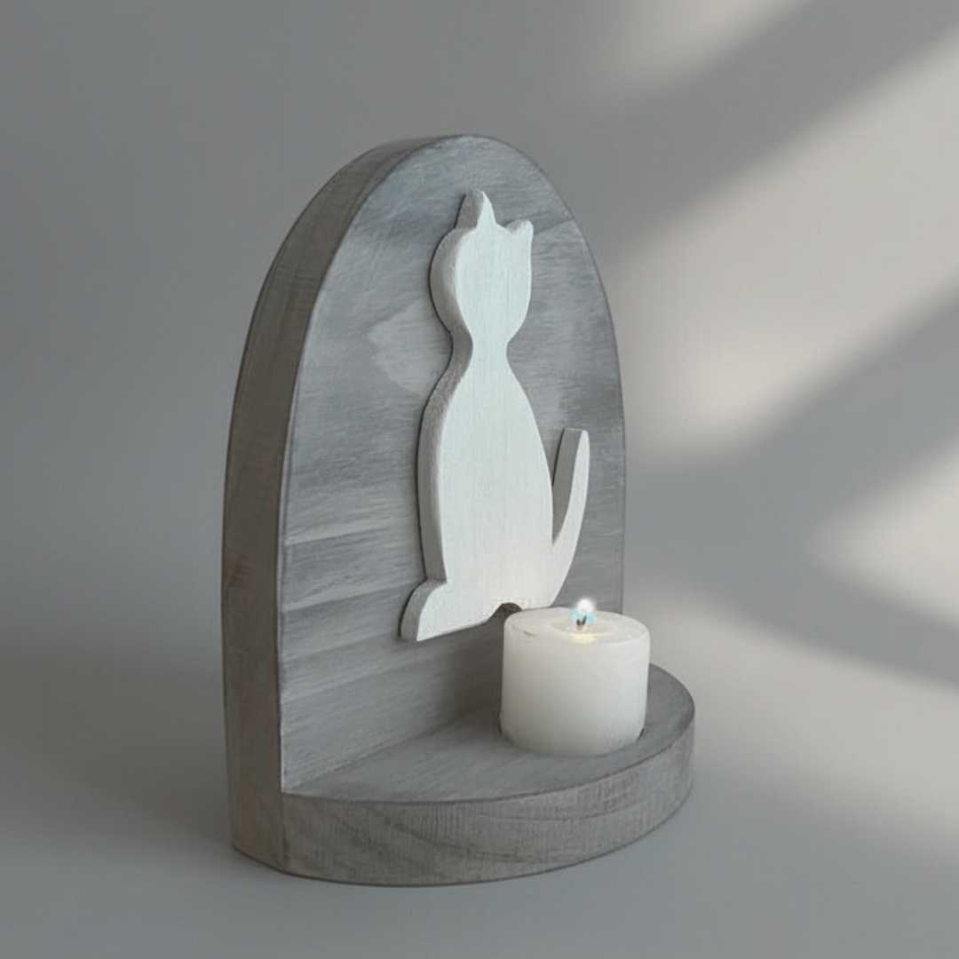 El Altar de Gatito en Madera de nuestra colección de Recuerdos es un espacio de recogimiento diseñado para quienes han despedido a un miembro fundamental de la familia: su gato. Este santuario de mesa, con su delicada silueta de gatito y una pequeña estrella central, ofrece un lugar de consuelo donde la luz de una vela permite honrar la alegría y compañía que tu «michi» brindó a tu hogar.