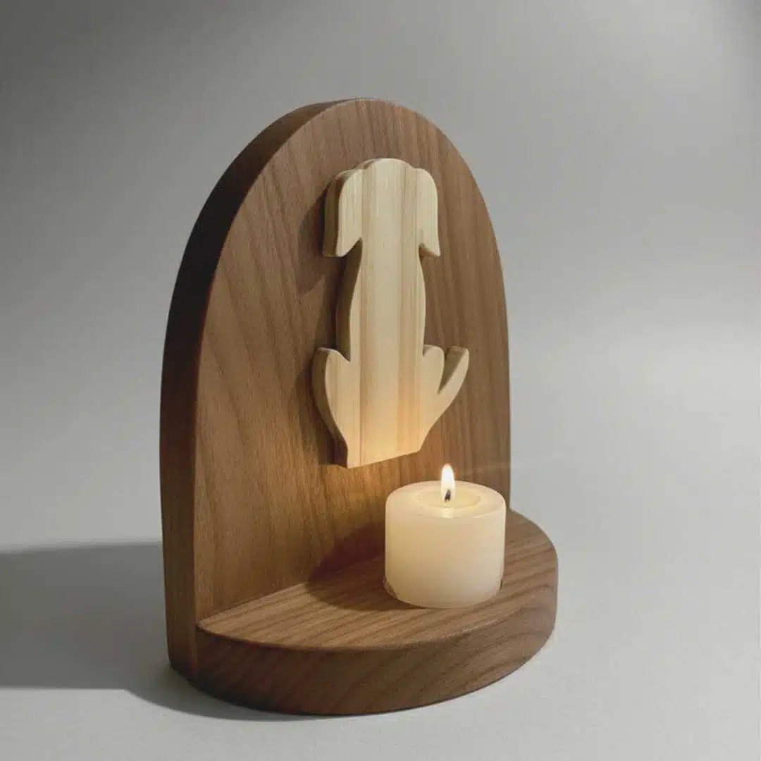 El Altar de Perrito en Madera de nuestra colección de Recuerdos es un espacio de recogimiento íntimo, diseñado para quienes desean rendir tributo a ese amigo fiel que dejó una huella imborrable. Este santuario de mesa, con la silueta de un perrito y una pequeña estrella central, ofrece un lugar de paz donde la luz de una vela permite recordar con gratitud la alegría y el amor incondicional que brindó a tu hogar.