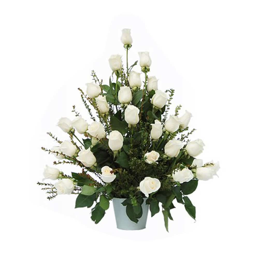 Arrimo de 25 rosas, toques de Aster y follaje.
