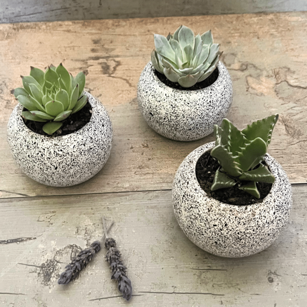 • Suculenta de 9 x 11 cm en macetero ovalado o cuadrado de hormigón, según stock.