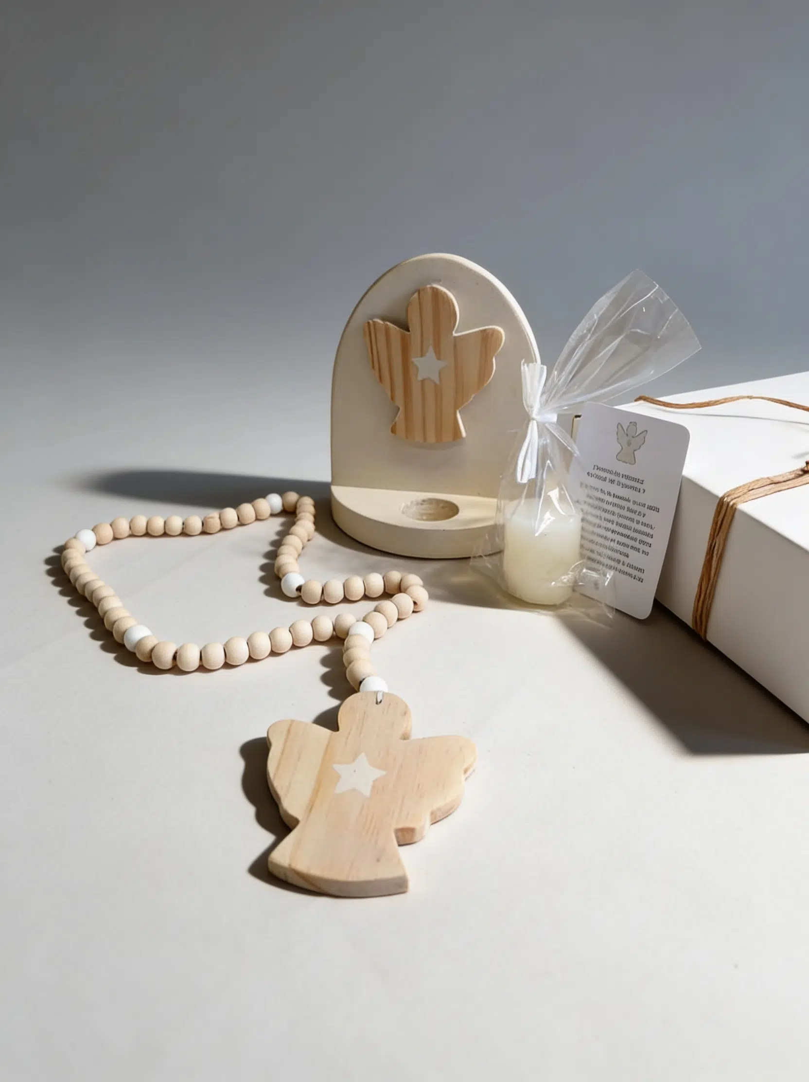 Altar de Ángel (16×13 cm): Un altar de mesa en madera beige con la silueta del Ángel de la Guarda en madera natural. Su diseño de capas simboliza la compañía constante y la protección eterna.