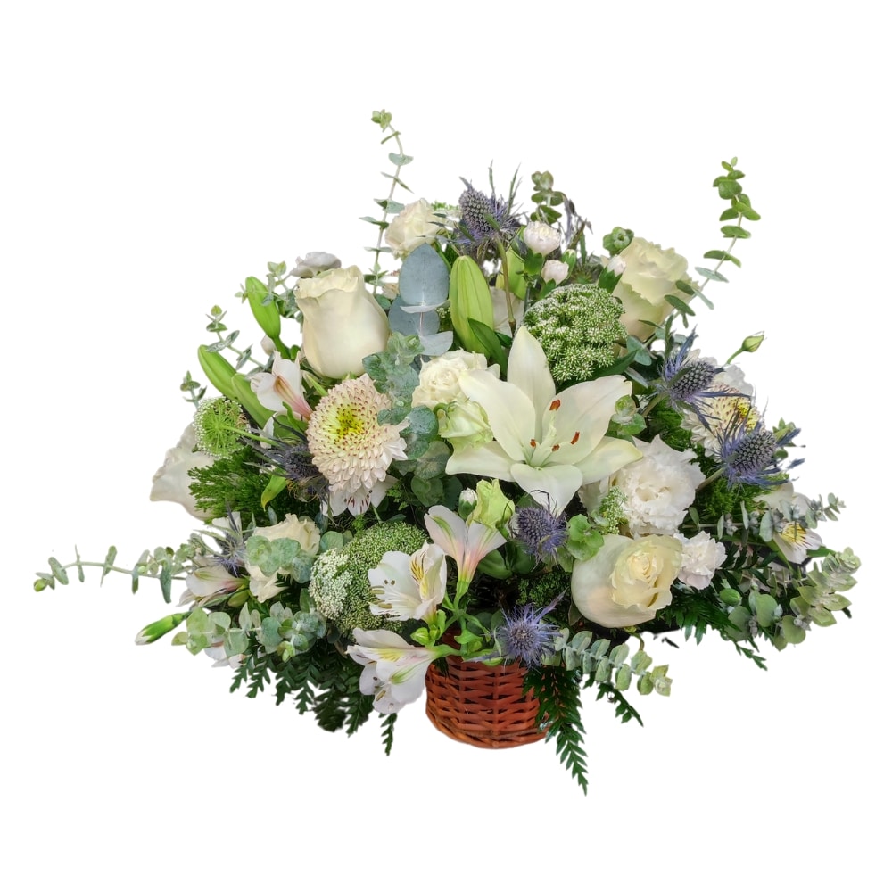Hermosa cesta de mimbre con rosas importadas, lilium, eringios, lisianthus y mini claveles.