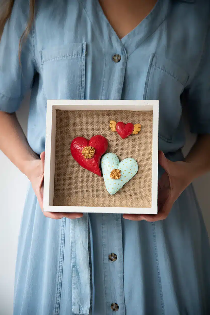 Corazones: Papel maché modelado a mano con técnica y color.