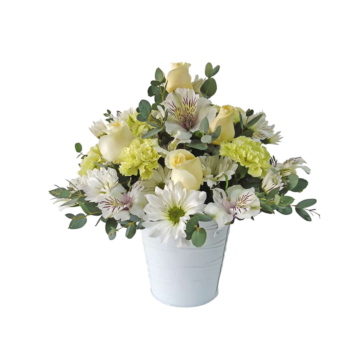 Hermoso balde con margaritas, rosas, alstroemerias y eucaliptus.